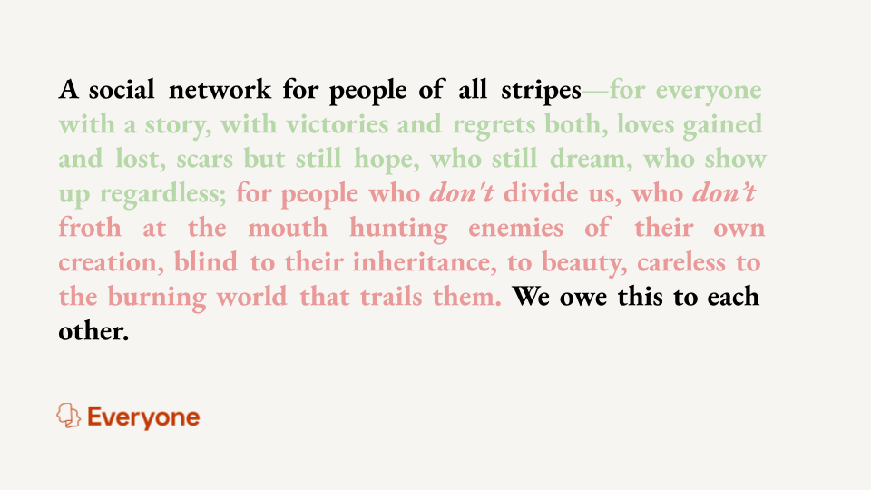 Hey everyone! The founding team at Before You Apply is building Everyone: a social network for people of all stripes.